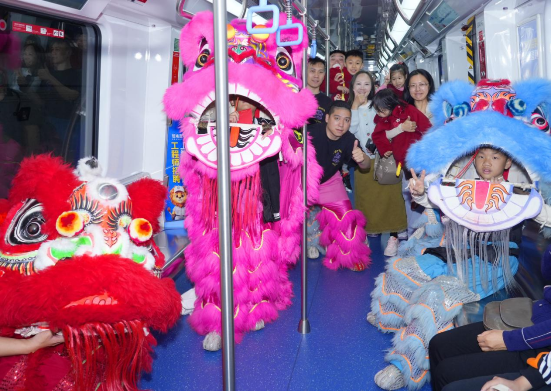 今年,全市各镇街的醒狮团队搭乘地铁1号线奔赴同一个约定:由东莞市委宣传部、市“百千万工程”指挥办指导,东莞市文化广电旅游体育局主办,东莞市文化馆、东莞市非物质文化遗产保护中心承办的“新春进莞来 非遗过大年”系列活动之“民俗大巡游”——2026百狮迎春非遗巡演活动。车厢里忽然挤进一群“狮子”,小孩瞪大眼睛盯着看,大人笑着举起手机。有人发了条朋友圈:“大年初二,和醒狮一起坐地铁。”这一路,欢声笑语跟着列车,一路向前。