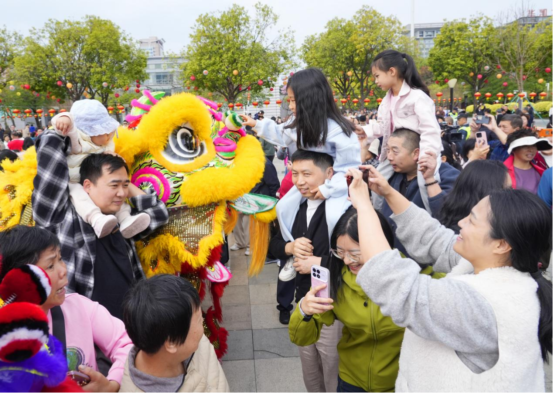 “摸摸狮头,万事不愁;摸摸狮尾,顺风顺水。”孩子们争着伸手去摸,大人也跟着上前沾福气。有人摸完狮子,转身给孩子整理衣领;有人拉着狮子合影,笑得合不拢嘴。狮子在旁边眨眼睛、抖耳朵,人群里笑声不断。
