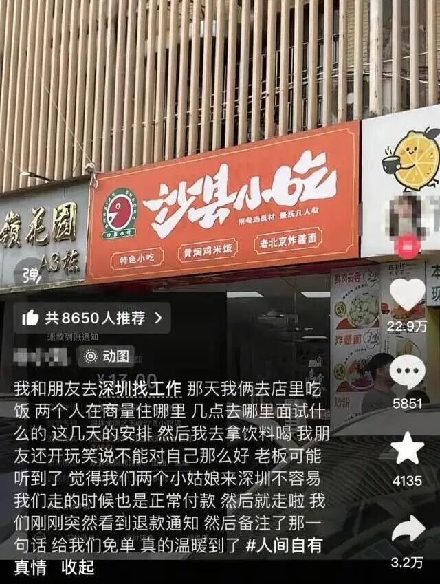 去年8月,龙岗一小吃店老板黄先生听闻店里两位女生就餐时讨论求职不易,悄悄将她们的13元餐费退还,并备注“欢迎来深圳,加油”。